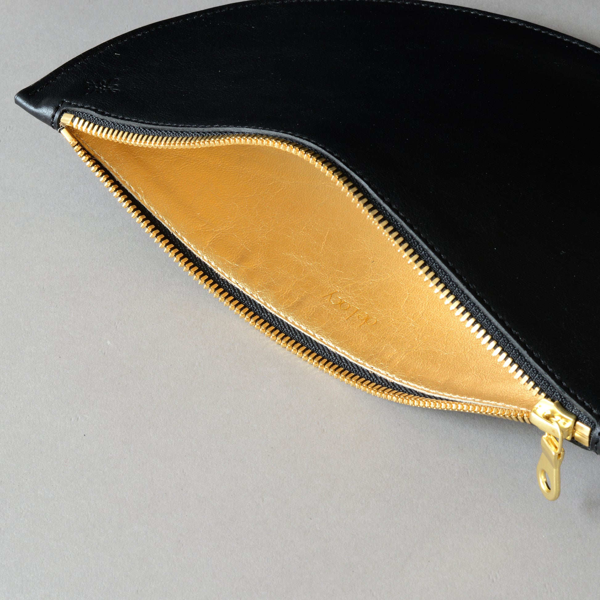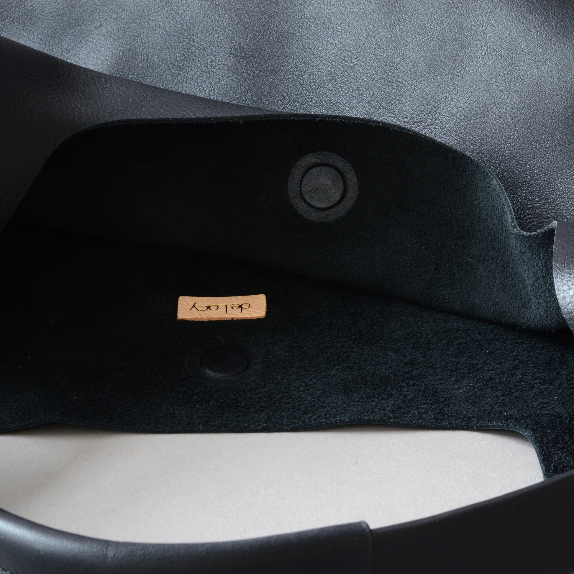 • de Lacy logo de-bossed on top right corner & gold foiled on leather tab inside.