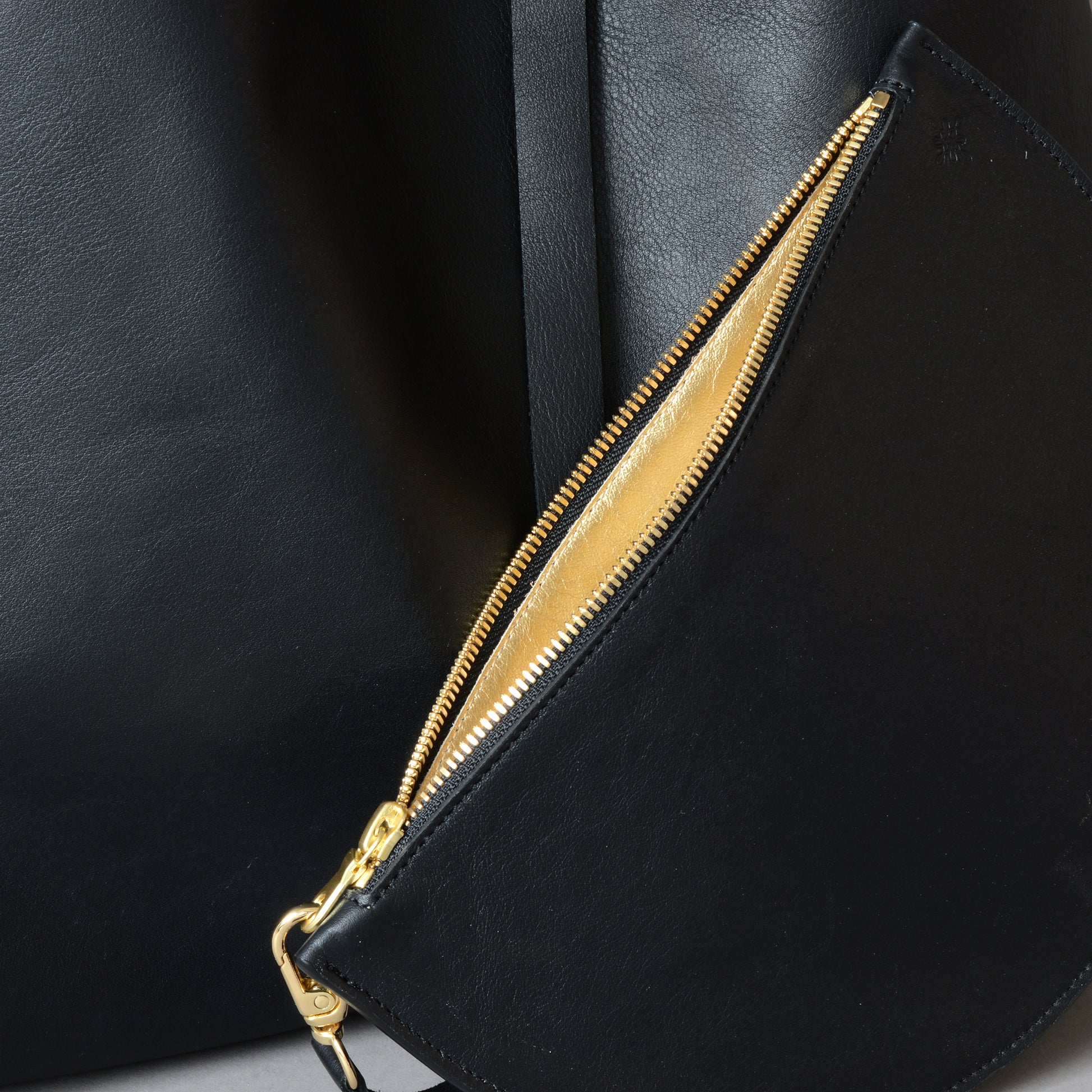• Detachable cresent clutch bag with a Ykk excella zip closure and lined in a metallic gold leather.