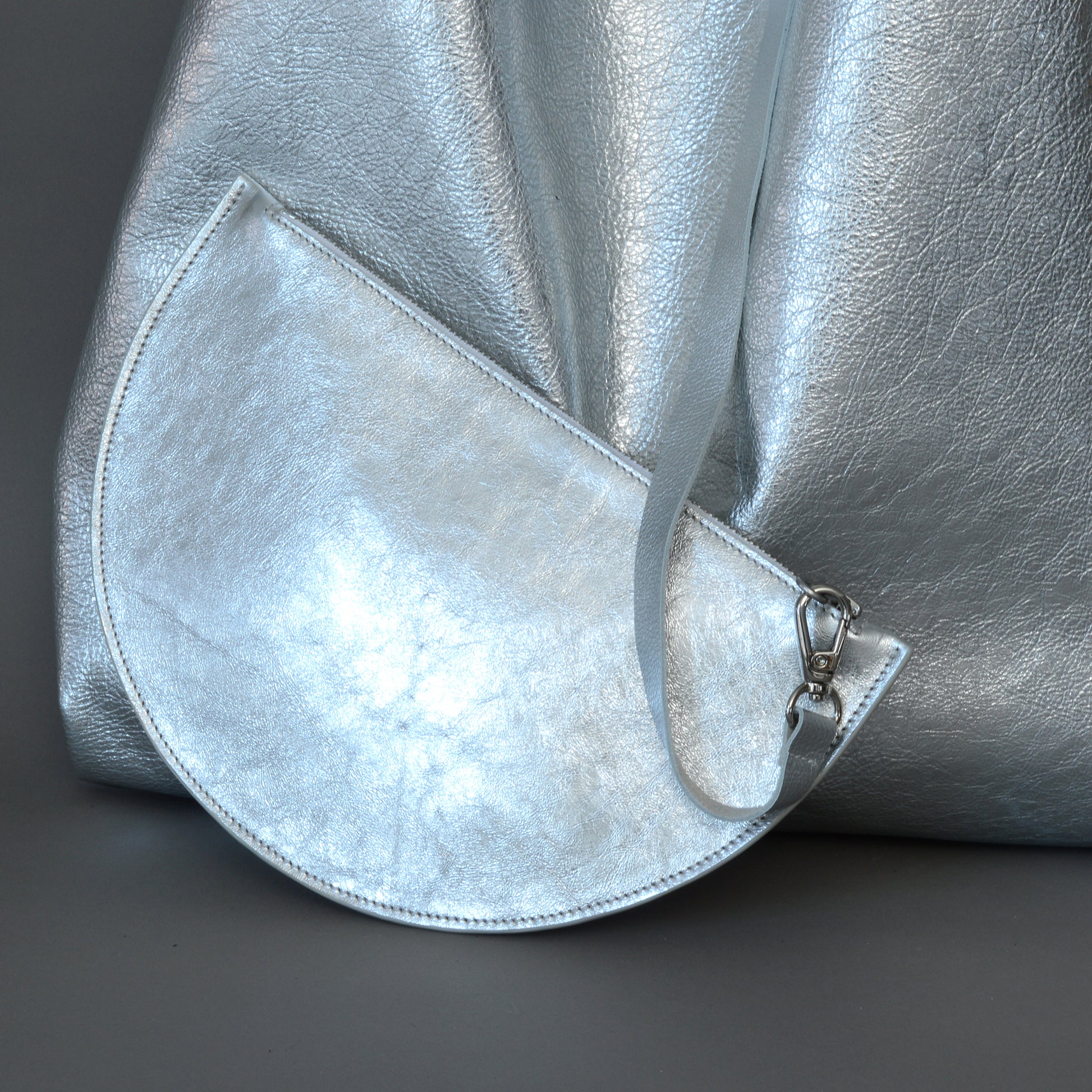 - Features metallic silver natural grain soft slouchy leather from Italy.