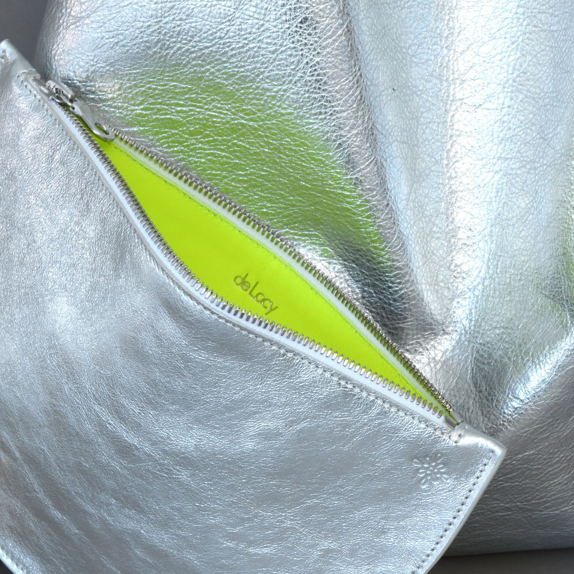 - Detachable silver leather half moon clutch bag pocket with silver Ykk Excella zip closure, lined in a bright neon yellow nappa leather.