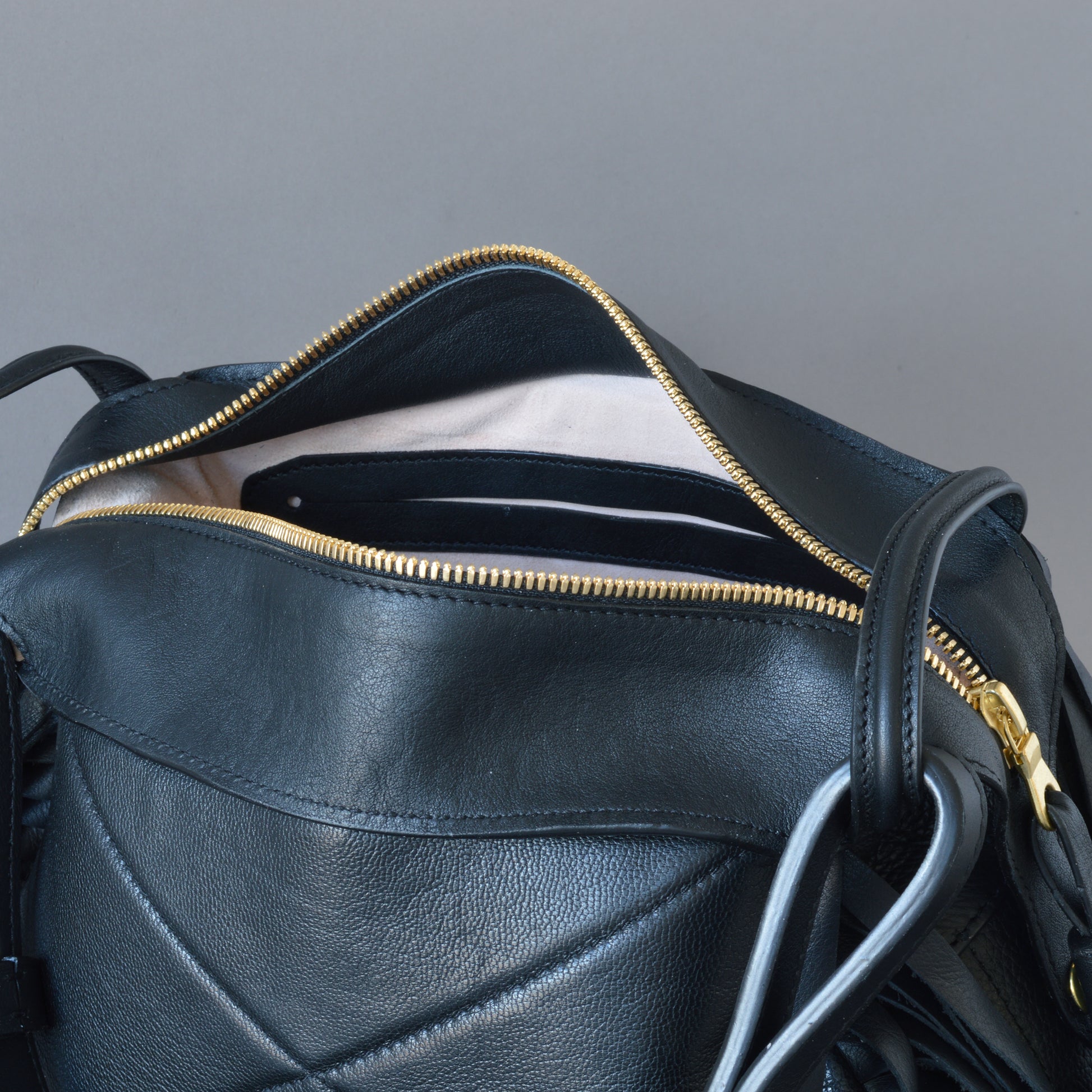 - Top Ykk Excella gold zip closure with chunky leather tassel zip puller.