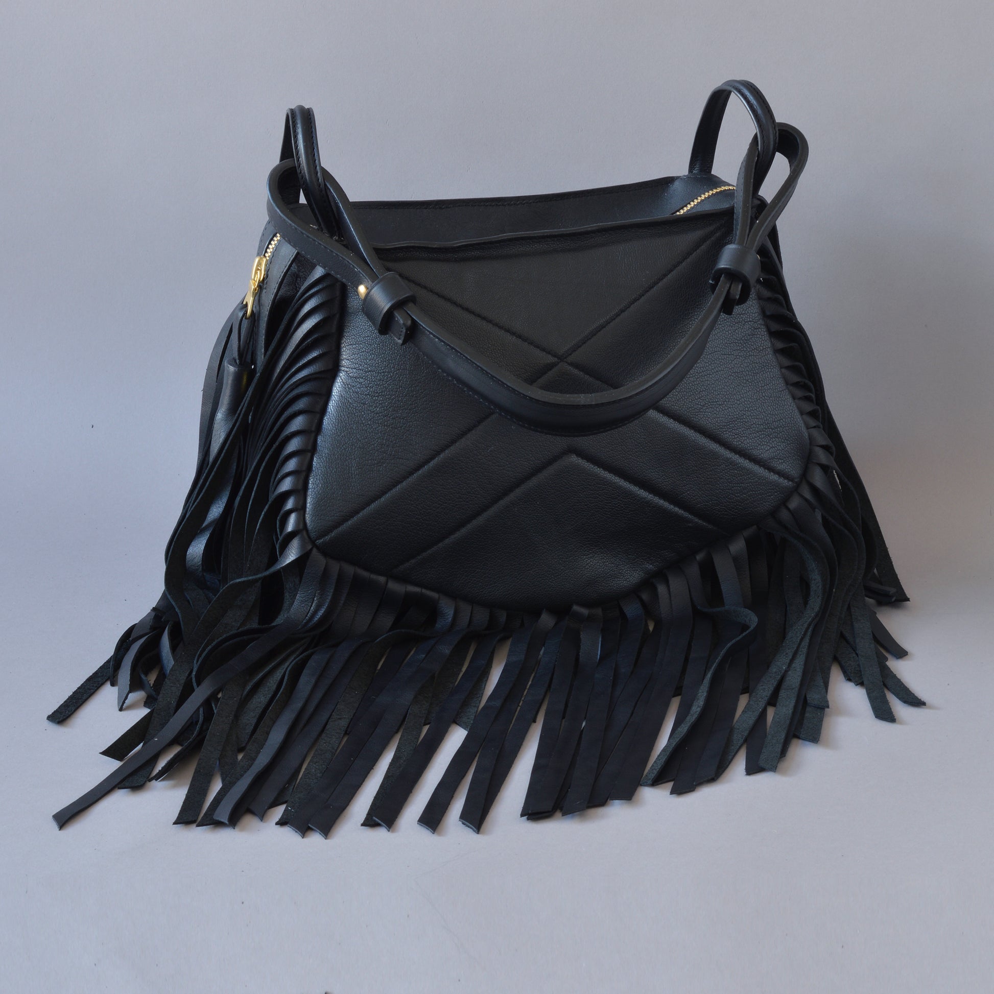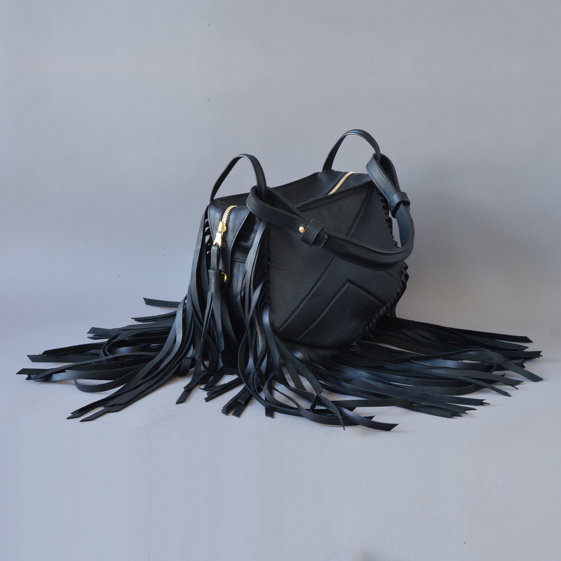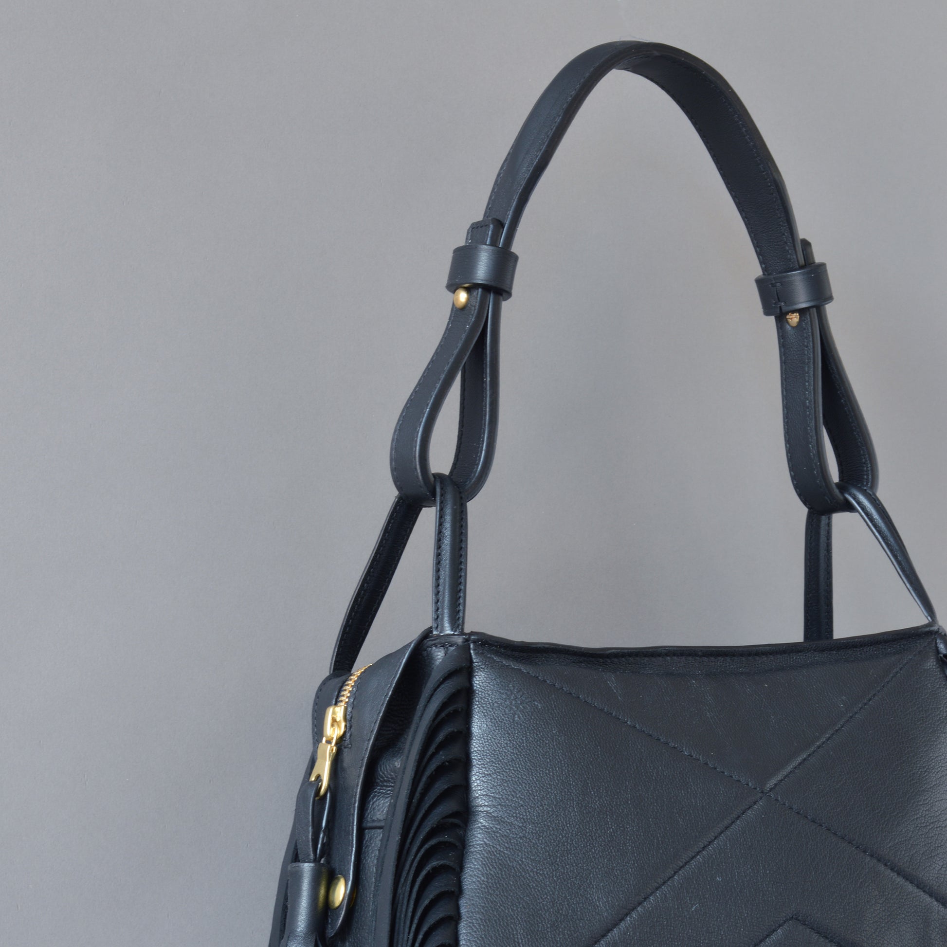 - Features black leather from pre loved motor cycle jackets and in house remnants.