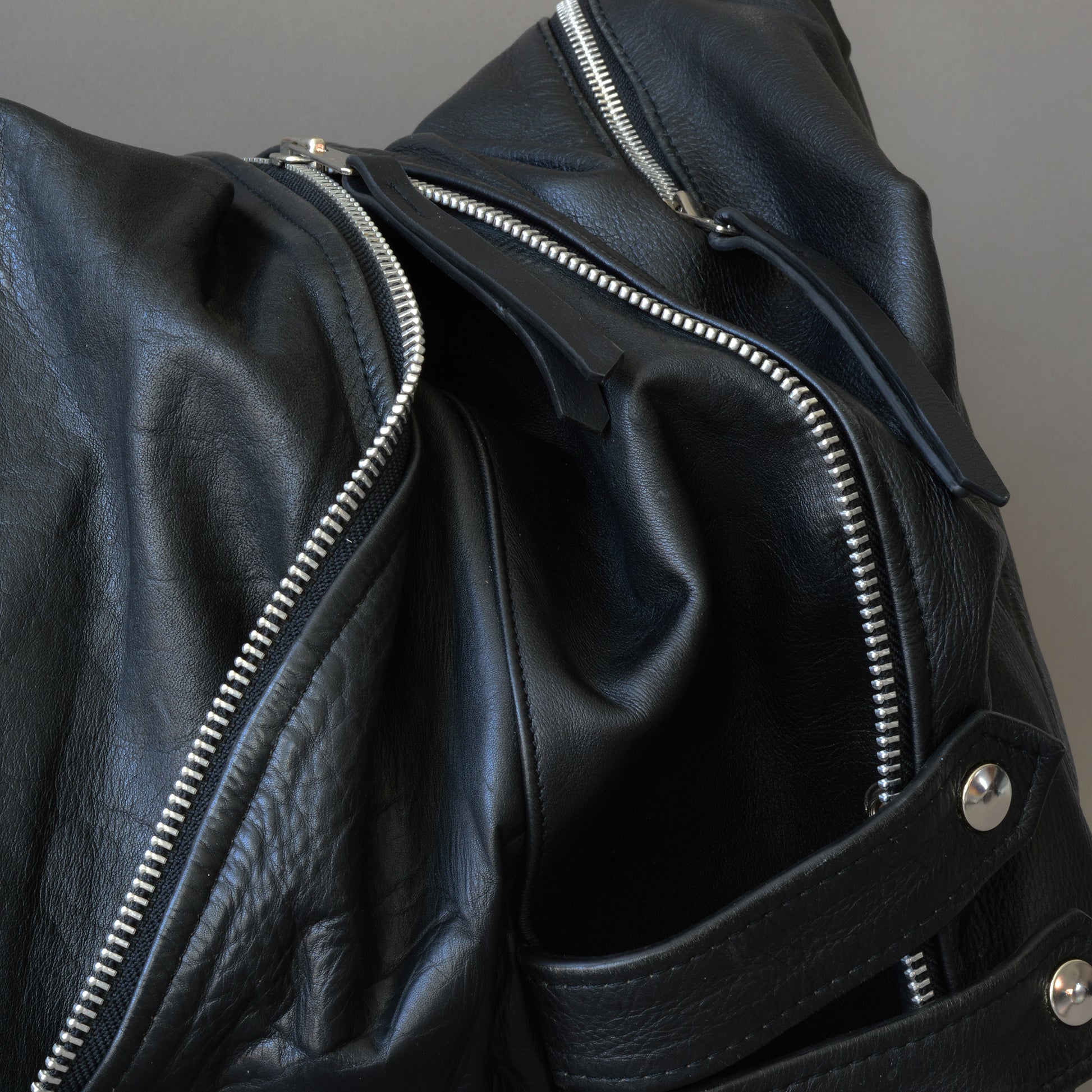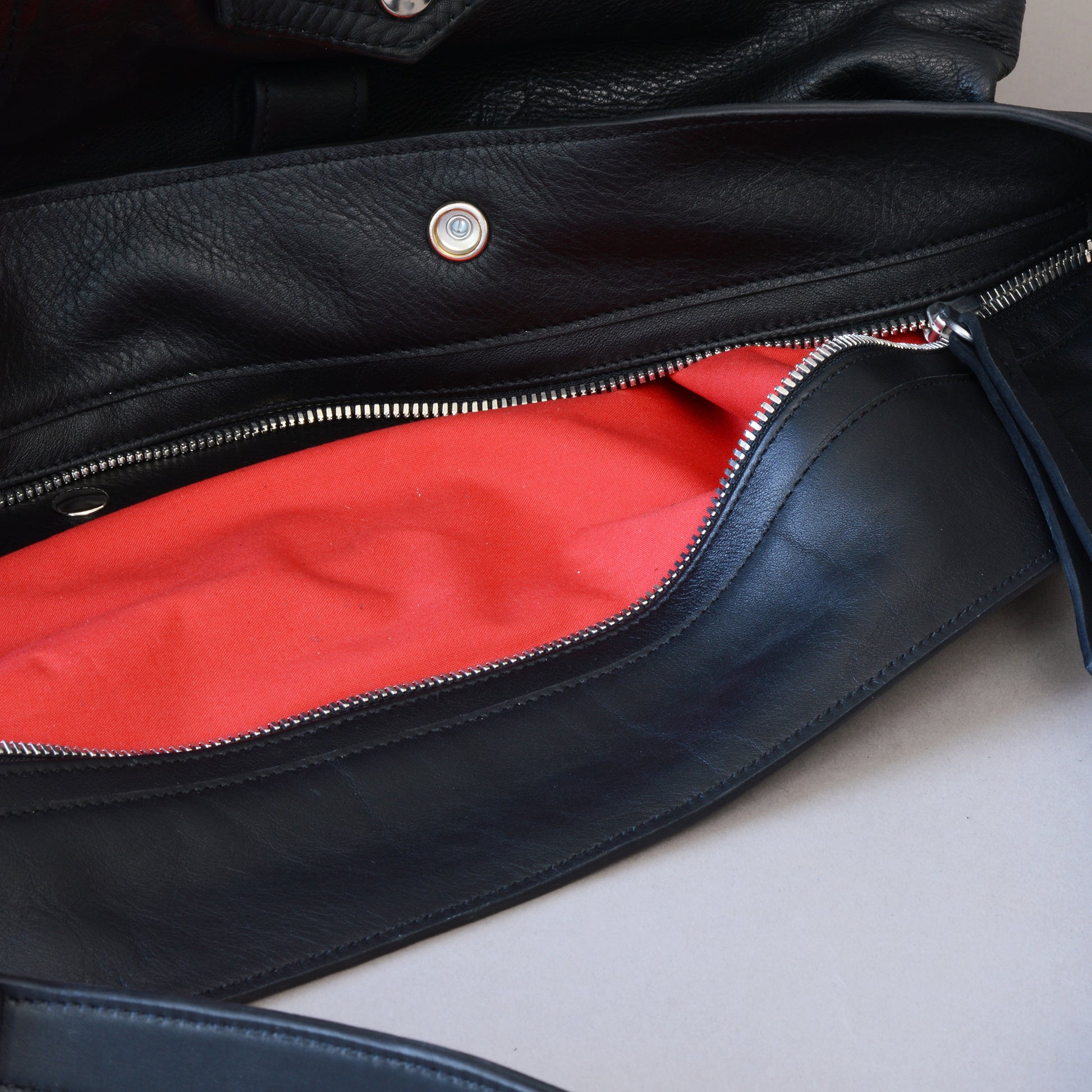 • Internal Ykk Excella zip pocket with leather trim & large leather slip pocket.