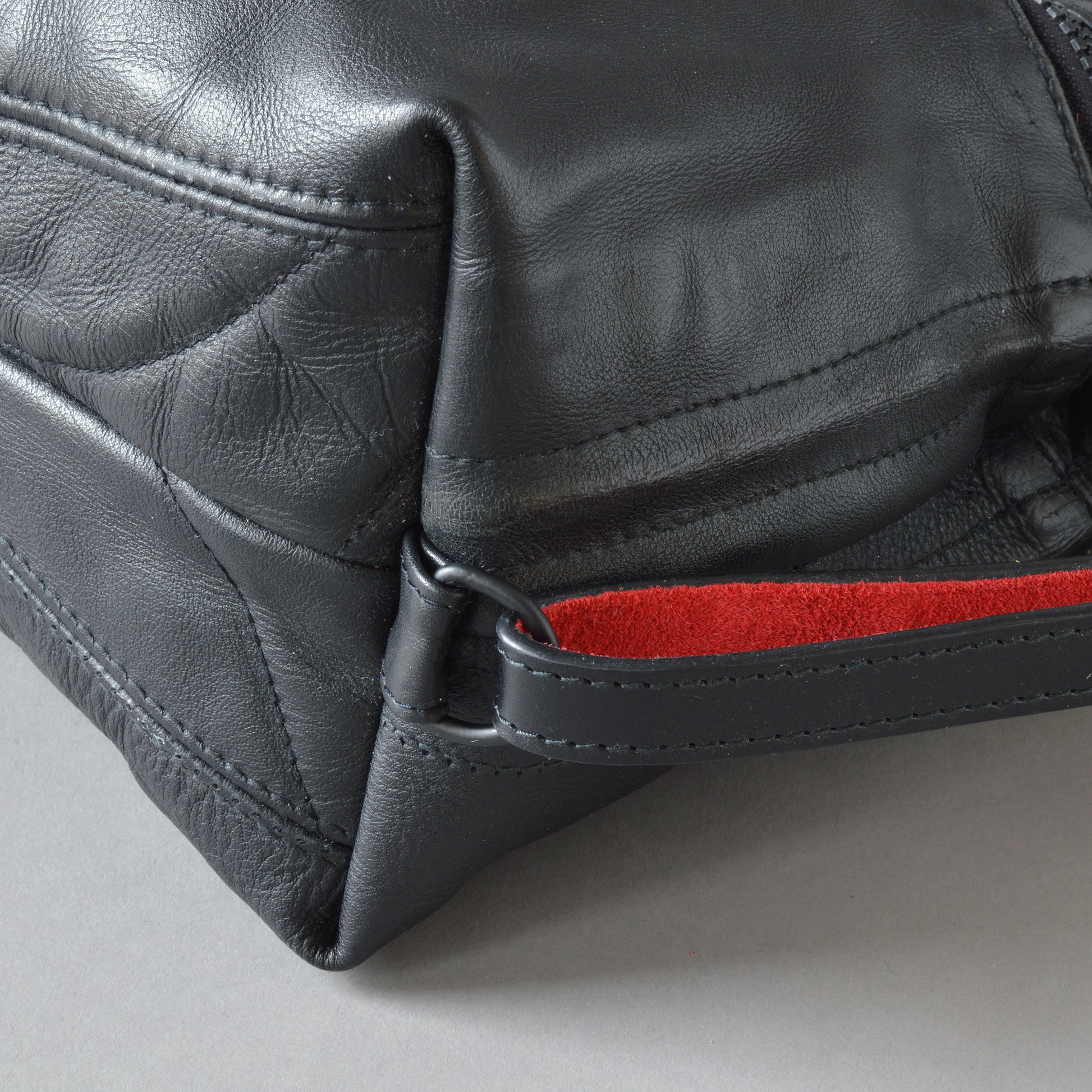 • Black Swedish bridle leather handle strap & zip puller lined in red Italian pig skin suede and edge finished by hand with matt black leather edge paint.