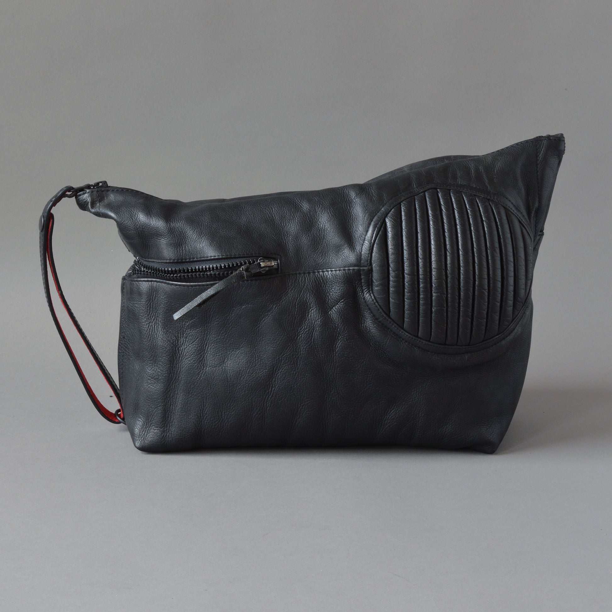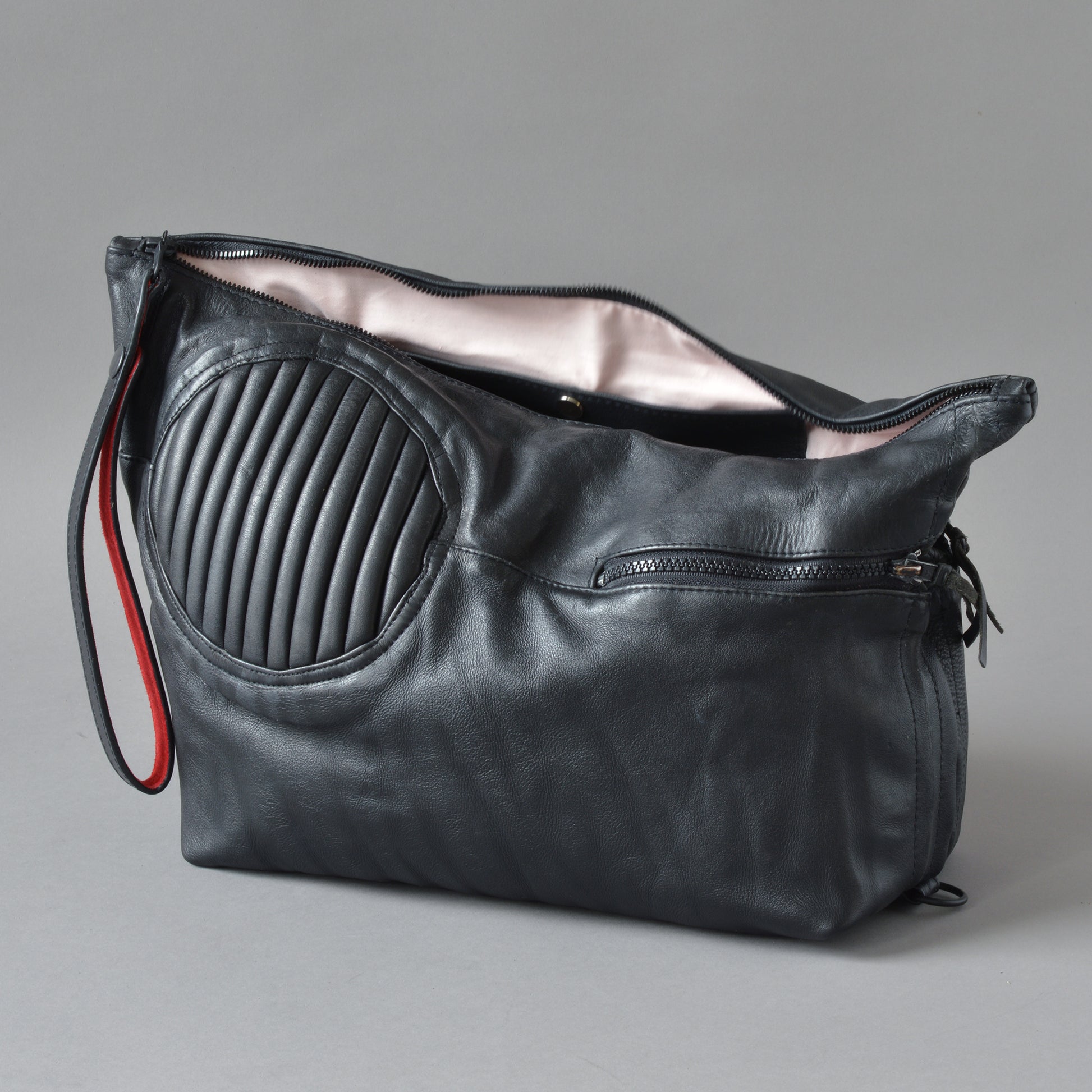 • This one of a kind clutch bag is reconstructed from a high quality Lewis Leathers motorcycle jacket and is numbered signed and dated inside.
