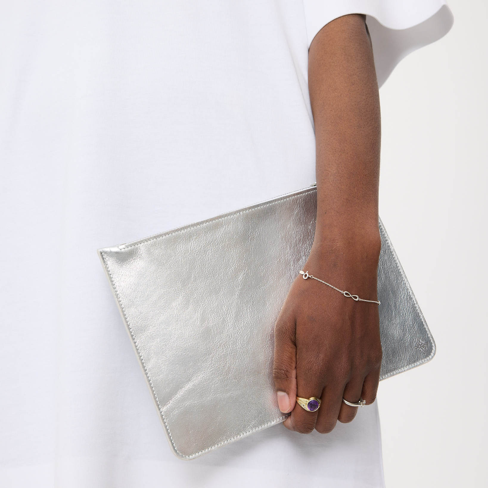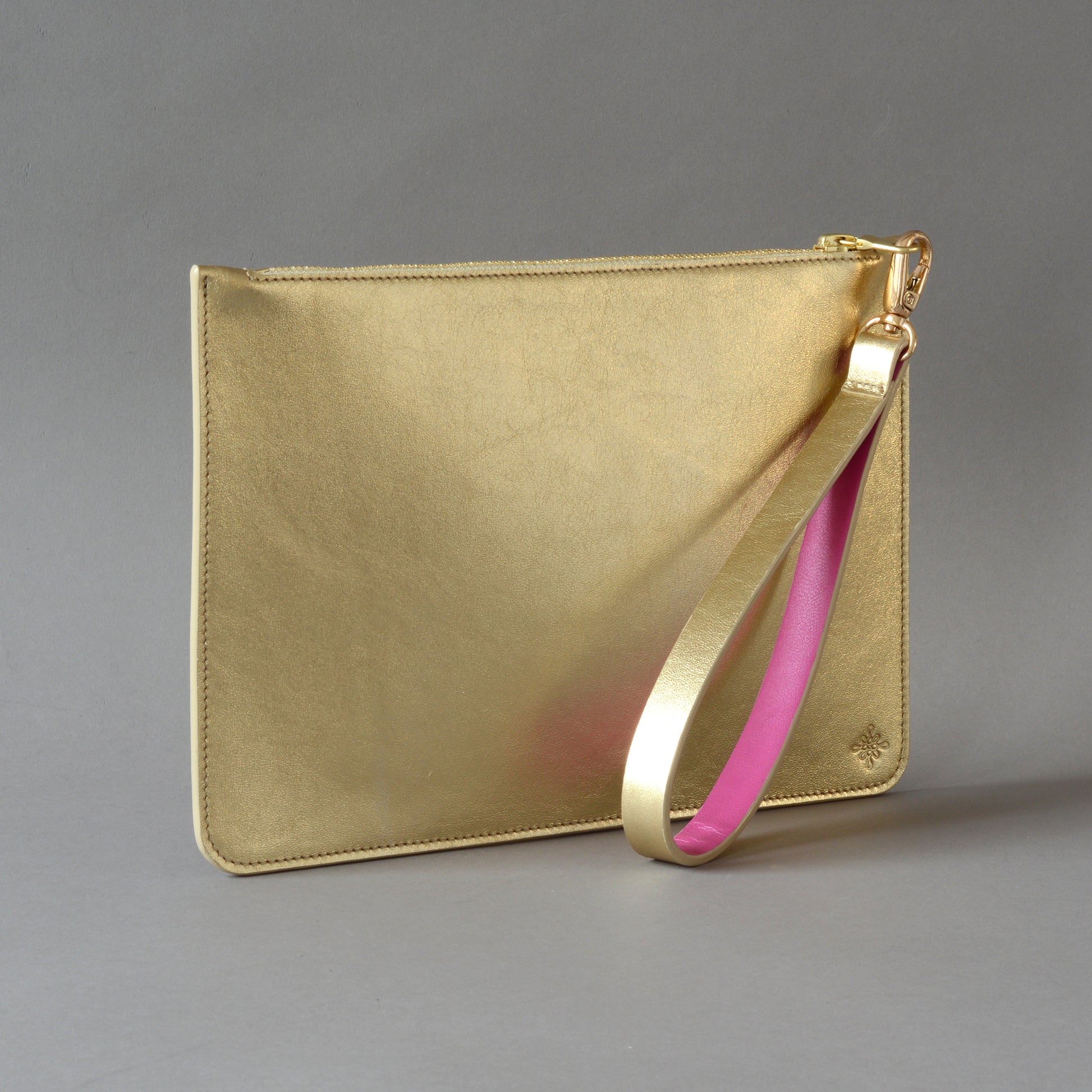 - Detachable gold leather wrist strap lined in pink leather which doubles as the zip puller.