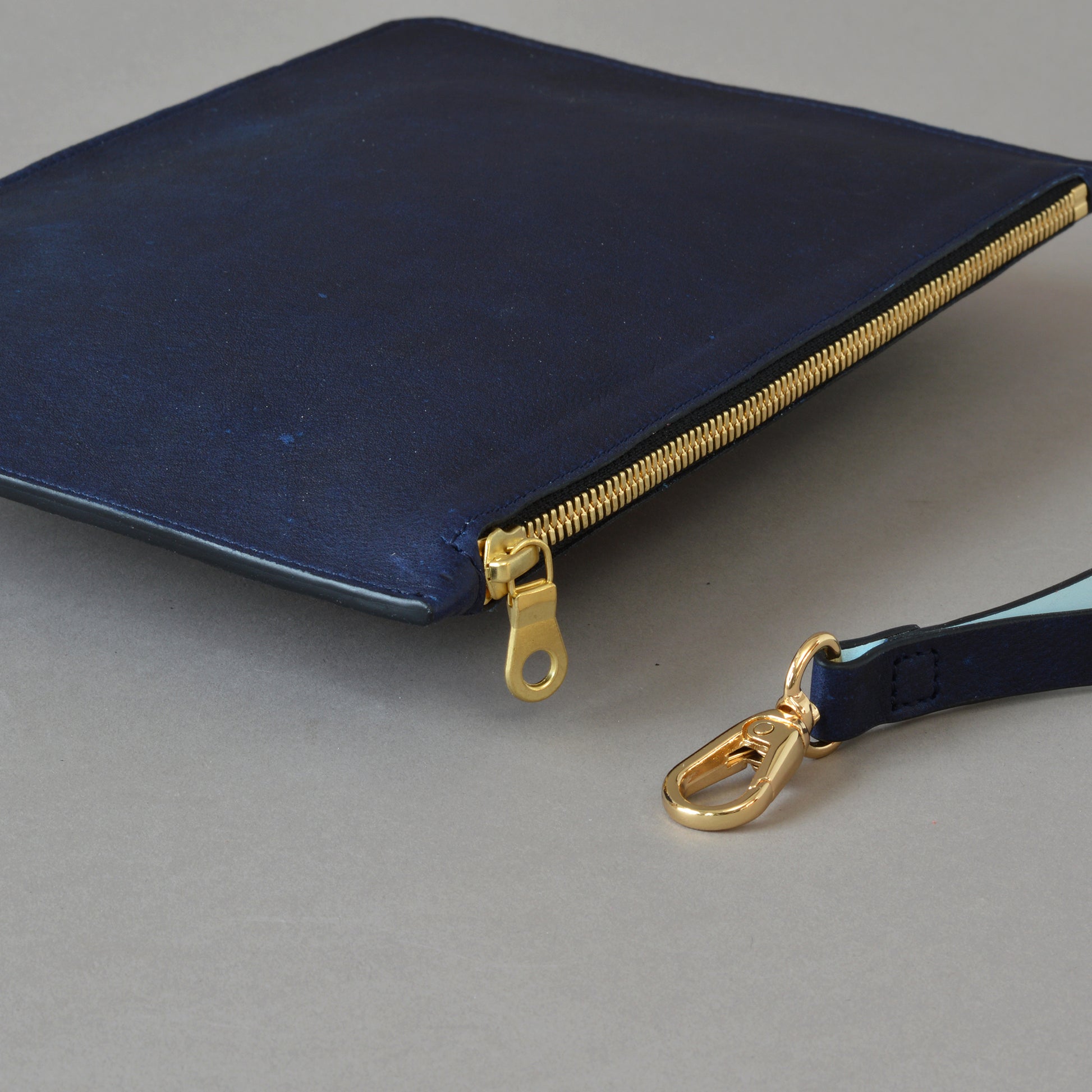 Indigo tanned leather clutch bag designed and handcrafted by Edward de Lacy.