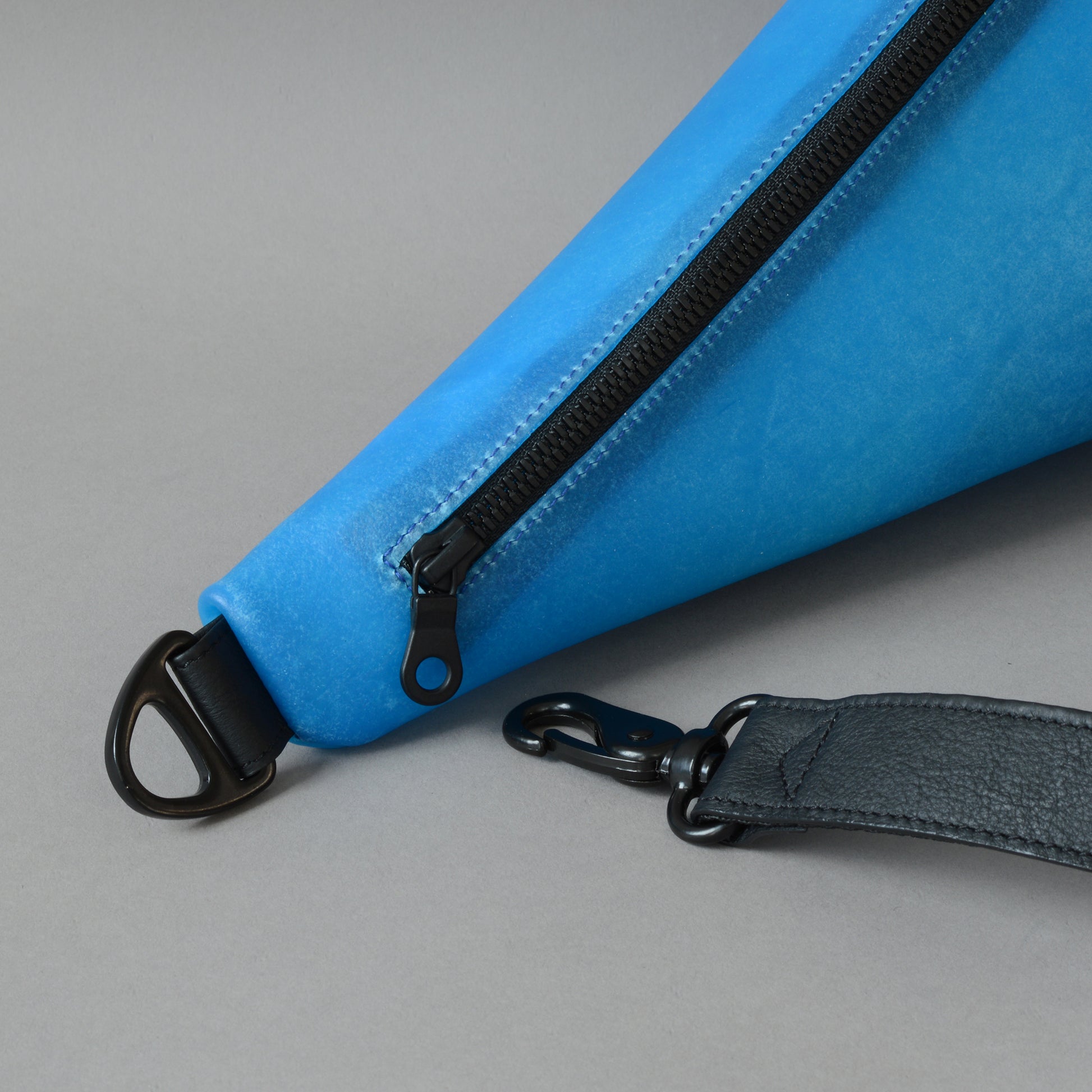 Blue leather sling bag designed and handcrafted by Edward de Lacy.